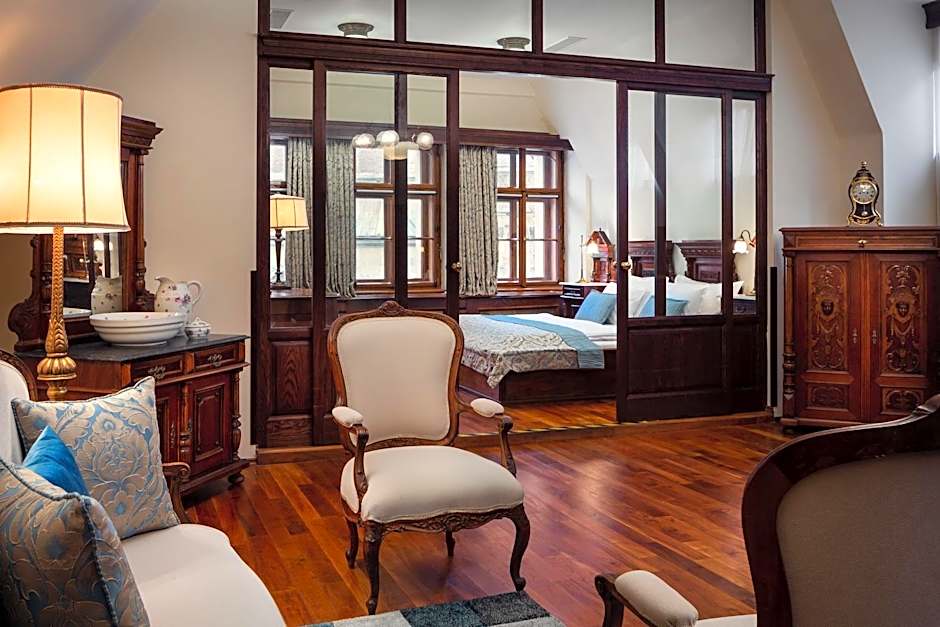 This large suite has a private sauna, a marble bathroom with make-up mirror, a bedroom with a king-size bed, and a living room decorated with antique furniture. It features video on demand and provides dressing gowns. The suite offers panoramic views of Old Town Square, Old Town Hall, the Astronomical Clock, and Tyn Church.